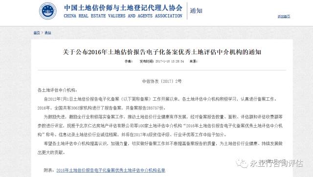 1月10日,中國土地估價師與土地登記代理人協會(以下簡稱“中估協”)公布了“2016年土地估價報告電子化備案優秀土地評估中介機構”名單,永業行獲得此項榮譽稱號,湖北省排名第一,全國第九。