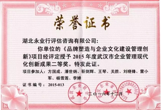 在此次評選中,永業行作為民營企業與在漢央企、本地大型國企進行角逐并最終獲獎,也是唯一獲獎的咨詢評估服務業機構。永業行自成立以來,不斷加強企業文化建設,豐富企業文化內涵,將品牌塑造與文化建設相結合,并將其工作落到實處,使其滲入到每個員工的價值觀念中去,從而增強了公司競爭實力,實現了持續穩定健康地發展目標。