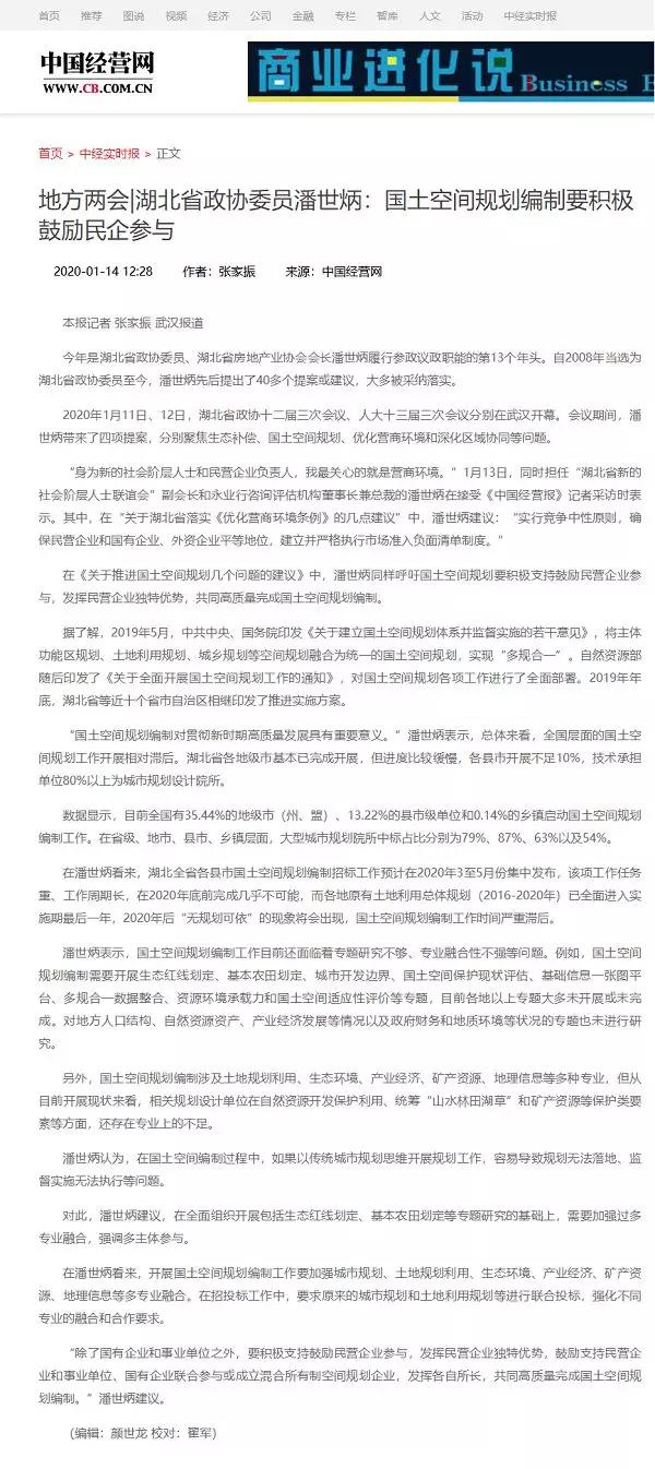 湖北省政協(xié)委員潘世炳:國土空間規(guī)劃編制要積極鼓勵(lì)民企參與