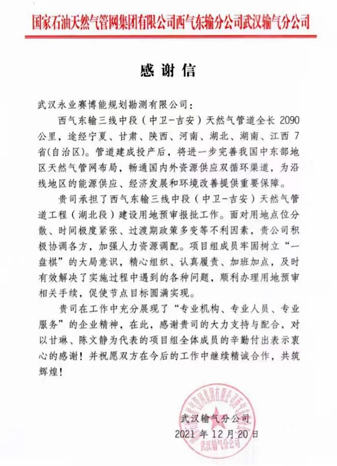 2021年12月20日,國家石油天然氣管網(wǎng)集團(tuán)有限公司(下稱“國家管網(wǎng)公司”)西氣東輸分公司武漢輸氣分公司致函永業(yè)行,對我司承擔(dān)的西氣東輸三線中段(中衛(wèi)-吉安)天然氣管道工程(湖北段)建設(shè)用地預(yù)審工作給予肯定和感謝。