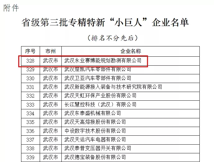 近日,湖北省經信廳公布了2021年第三批專精特新“小巨人”企業名單。通過申報和評審,永業行咨詢評估集團旗下武漢永業賽博能規劃勘測有限公司(下稱“永業賽博能”)榮登榜單!