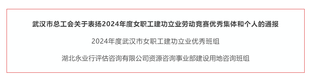 近日,武漢市總工會(huì)開(kāi)展的2024年度武漢市女職工建功立業(yè)勞動(dòng)競(jìng)賽優(yōu)秀集體和個(gè)人評(píng)選結(jié)果揭曉,經(jīng)各級(jí)工會(huì)遴選、推薦、申報(bào)及綜合評(píng)定,湖北永業(yè)行評(píng)估咨詢有限公司資源咨詢事業(yè)部建設(shè)用地咨詢班組獲評(píng)“2024年度武漢市女職工建功立業(yè)優(yōu)秀班組”。